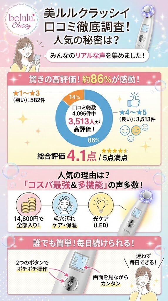 4,095件のたくさんの口コミがある中で、約86%もの人が満足しているのは、美ルルクラッシィがおすすめできる美顔器だから。