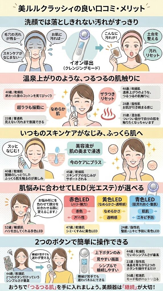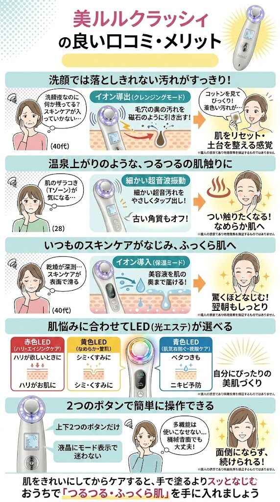 「みんなが満足している美顔器で失敗したくない!」という人には、美ルルクラッシィがおすすめ。