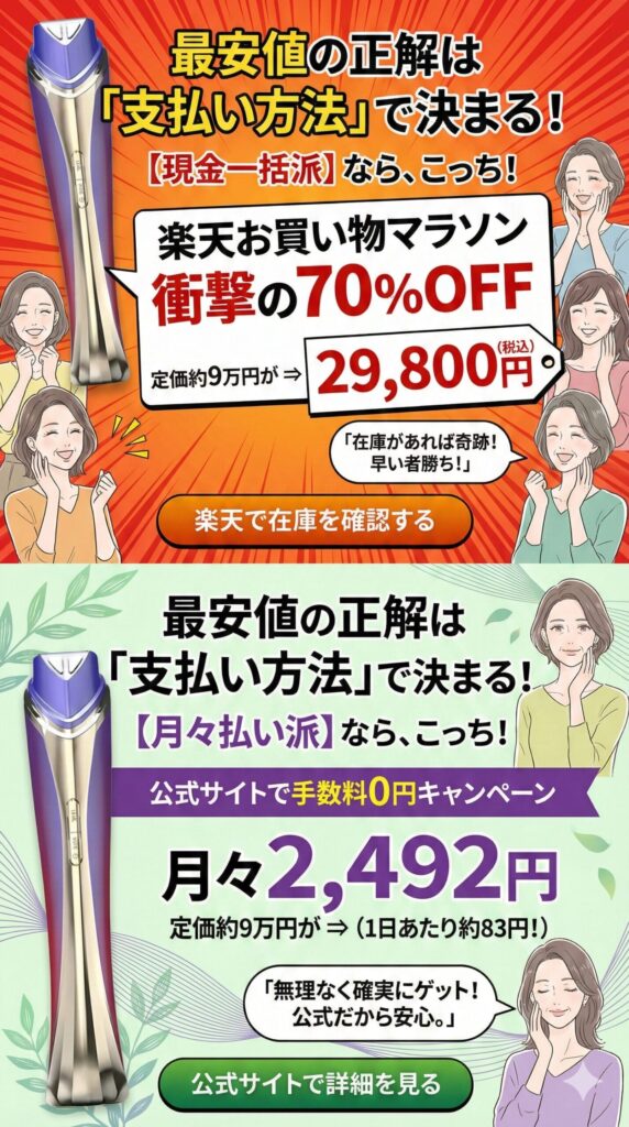 ディマーニ美顔器を最安値で買うには、一括なら楽天、月々払いなら公式が安心です。