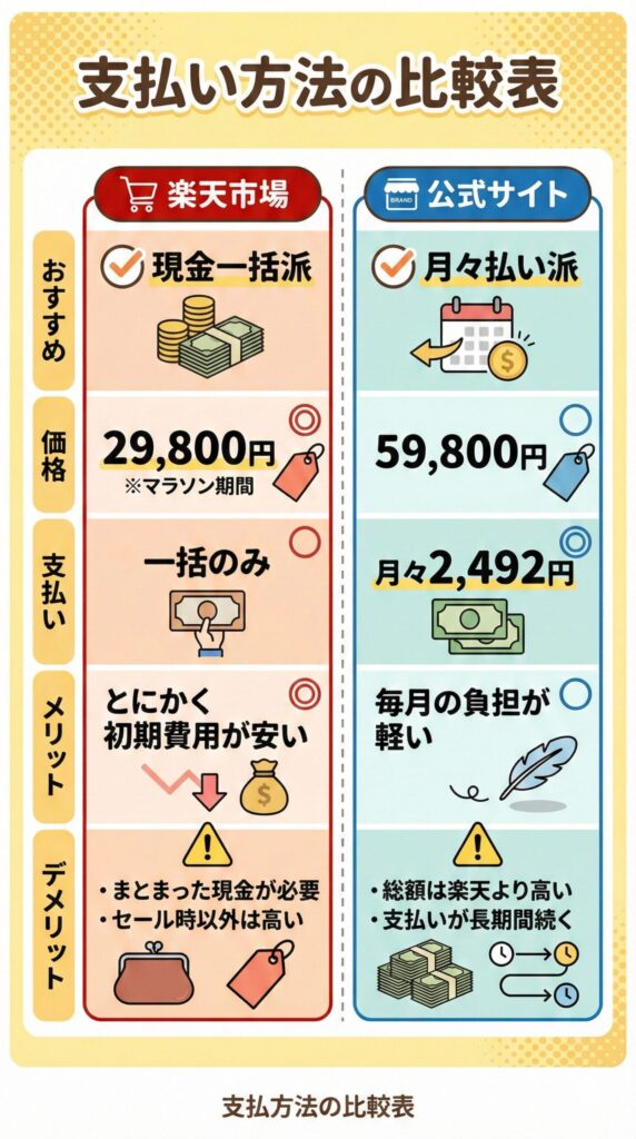 楽天が定価の99,800円だったり、月々2,492円で楽に払いたいなら、公式サイトを選ぶのが正解です。