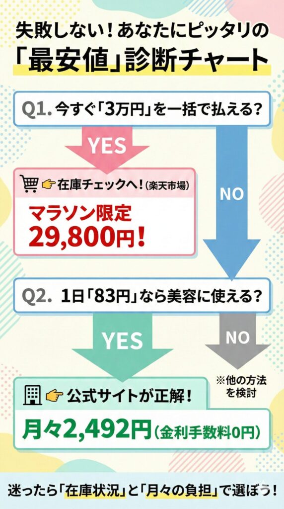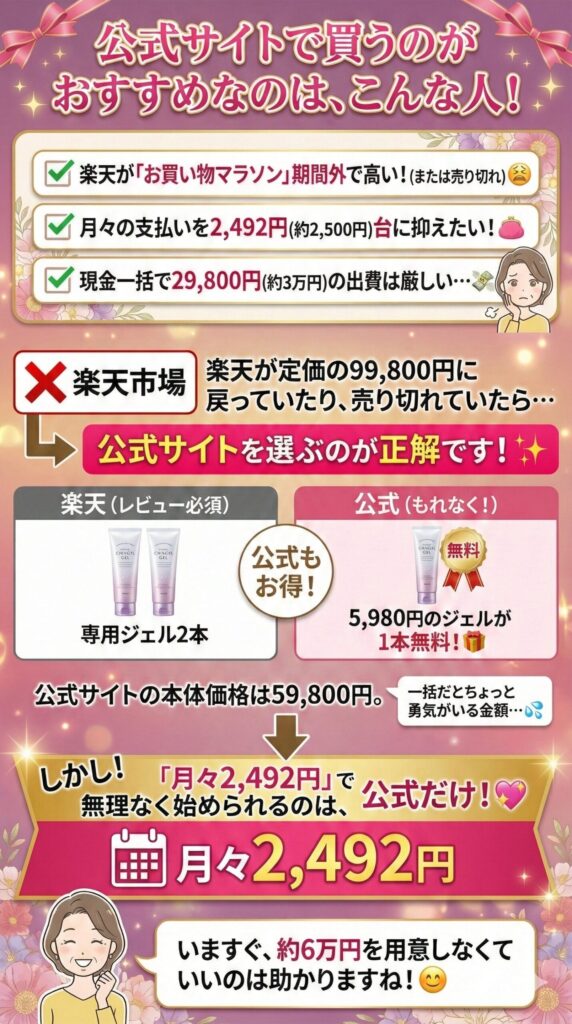 無理なく手に入れるなら、月々2,492円の分割払いで負担が一番少ない公式サイトがおすすめです。