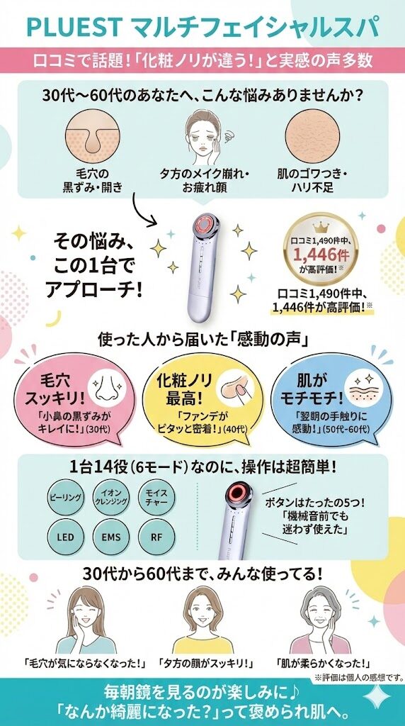 マルチフェイシャルスパの良い口コミで、「1台で14もの役割ができるのに操作が楽」という声があります。