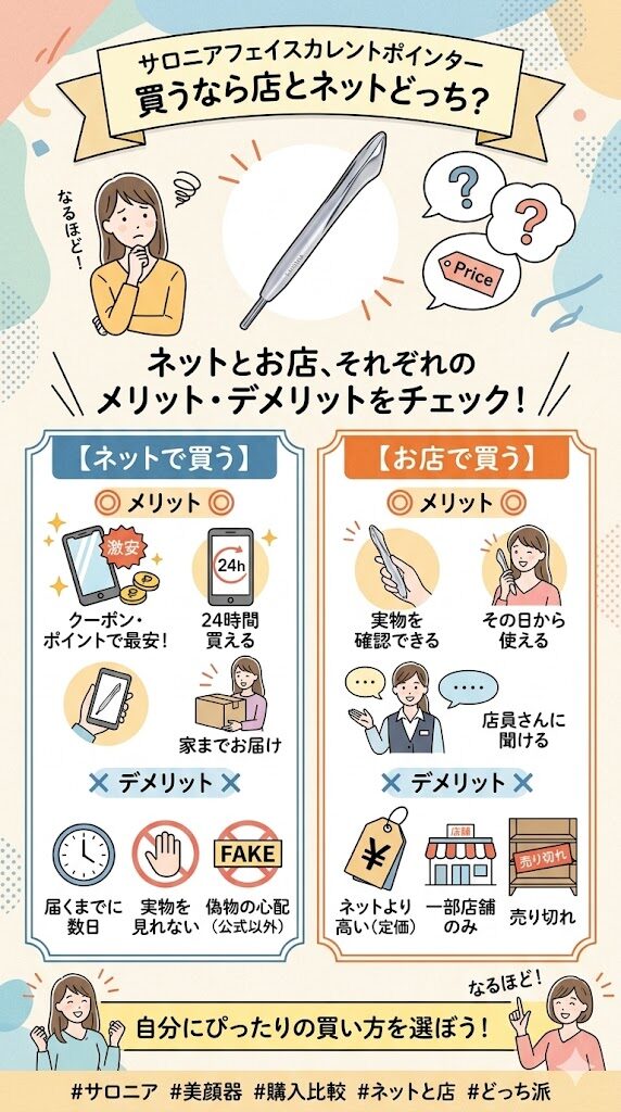 サロニアフェイスカレントポインターを買うなら店とネットどっちがいいのか、迷いますよね。