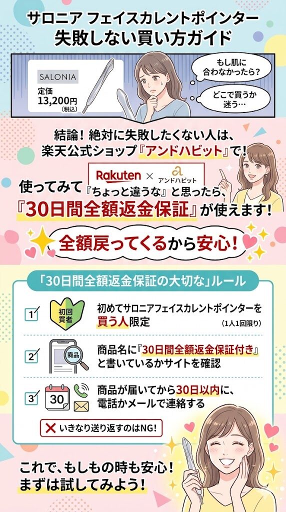 サロニアフェイスカレントポインターを使ってみて「ちょっと違うな」と思ったら、「30日間全額返金保証」が使えます。